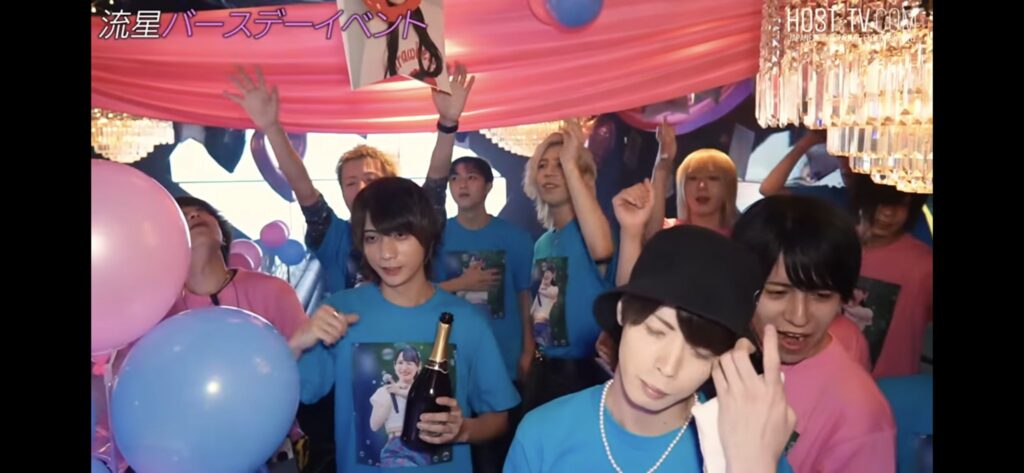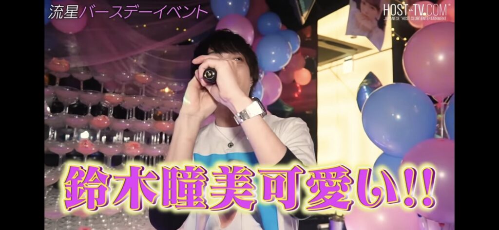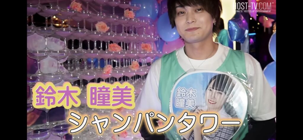 鈴木瞳美さんの大ファン(オタク)であるホスト流星さんのバースデイイベントで、鈴木瞳さんのグッズを身に着けてシャンパンタワーをしている姿