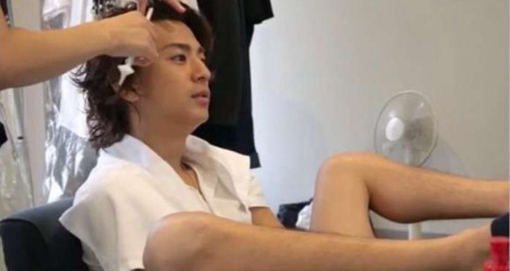 両足を机に上げた状態でヘアメイクしてもらっている三浦翔平さん。