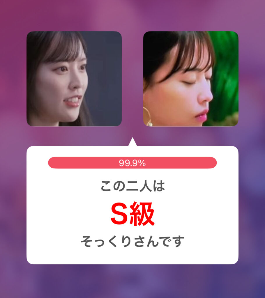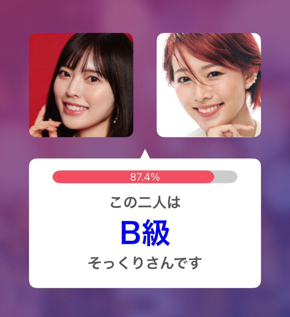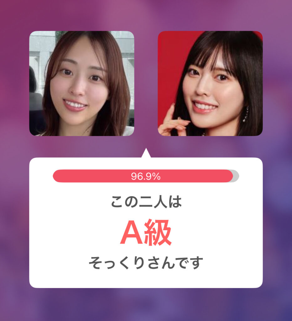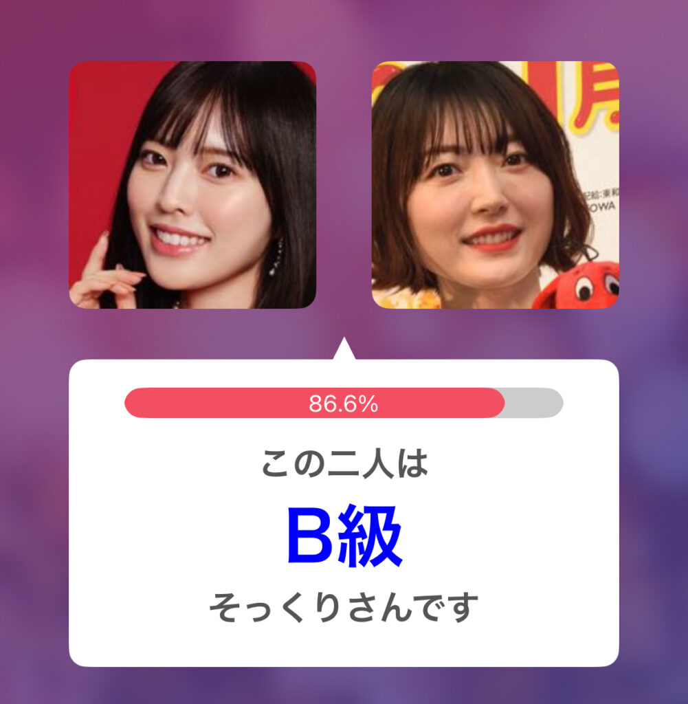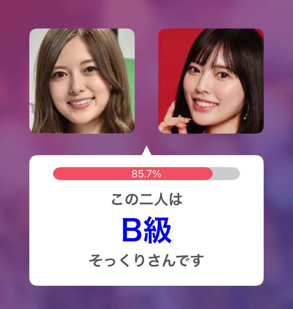 小川栞奈さんと白石麻衣さんのそっくり度は85.7%で似てる度B判定
