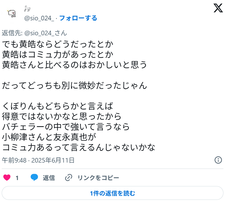 — ばら子🌹バチェラー6ネタバレ中 (@barakoporation) June 10, 2025