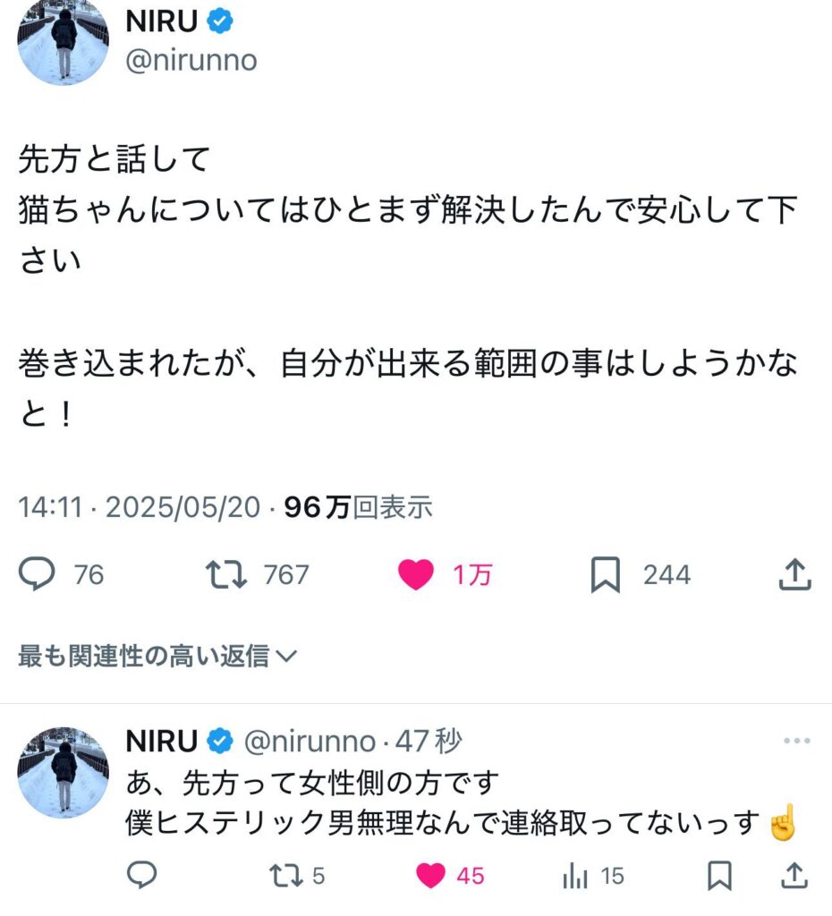 ニル(NIRU)先方と話して、猫ちゃんについてはひとまず解決したんで安心して下さい