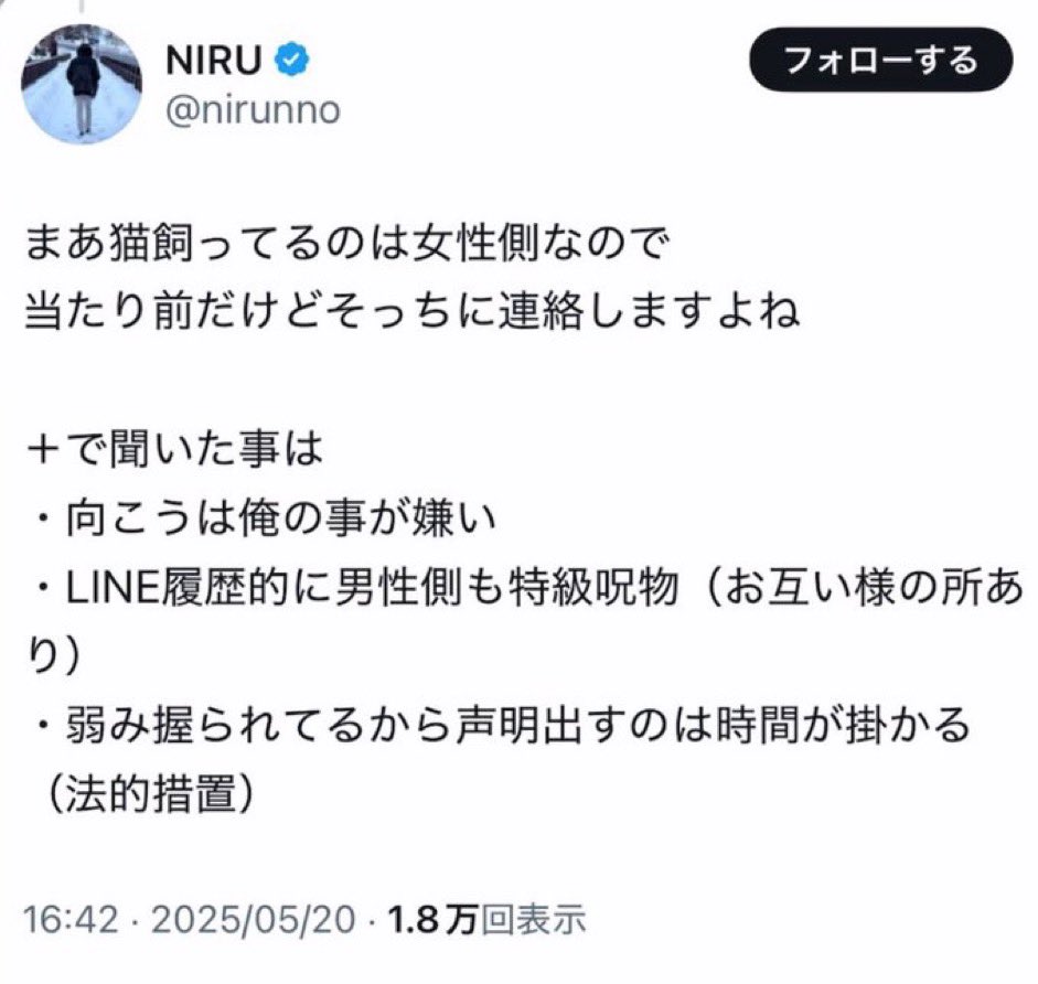 ニルさんを元カレって言ってて巻き込んだのは女性側なのに、男性側に「ヒステリック」とか「特級呪物」とか言ってるのはどうなの…